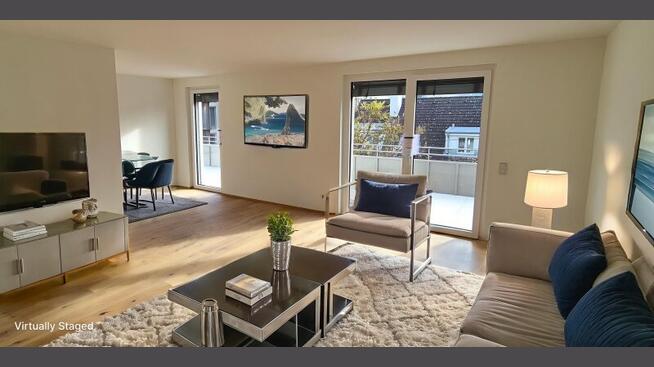 Der Wohnbereich besticht durch hochwertige Parkettböden und eine angenehme Fußbodenheizung, die für wohlige Wärme sorgt. Von hier aus gelangen Sie auf den einladenden Balkon, der sich perfekt für entspannte Stunden im Freien eignet – sei es zum Frühstück mit Blick ins Grüne oder zum Ausklang des Tages.