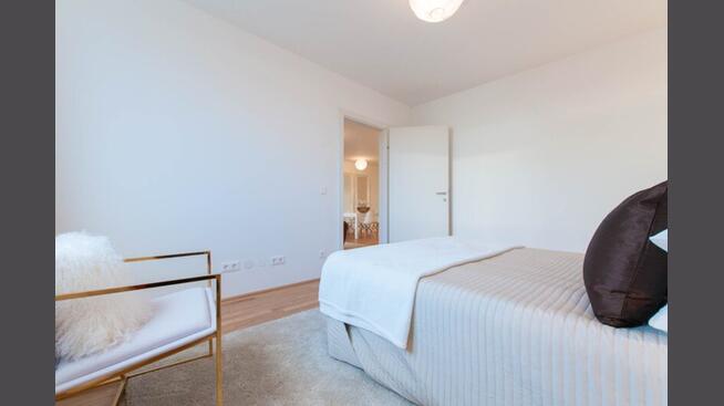 Das gut dimensionierte Schlafzimmer mit 12,37 m² Größe lässt sich ideal mit einem Doppelbett samt Nachtkästchen und einem großen Schrank ausstatten. Terrassentüren lassen viel frische Luft und Licht in den Raum und der Balkon lässt sich auch von hier aus begehen.