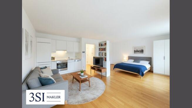 Diese moderne 1-Zimmer-Wohnung vereint Wohnen, Essen und Schlafen in einem offenen, harmonischen Raumkonzept.