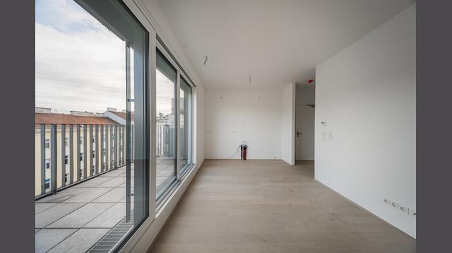 Vom einladenden Vorraum aus gelangen Sie direkt in die offen gestaltete Wohnküche, die durch ihre Helligkeit und den direkten Zugang zur Terrasse besticht. Die Terrasse rundet das Raumangebot perfekt ab und lädt zum Verweilen im Freien ein – mit Blick über die Dächer und einem Gefühl von Freiheit mitten in der Stadt. Vom Wohnbereich aus betreten Sie das Schlafzimmer, das über ein integriertes Badezimmer verfügt und somit ein Maximum an Komfort auf kompaktem Raum bietet.