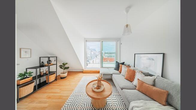 Die 2-Zimmer-Wohnung mit ca. 98 m² Wohnnutzfläche sowie einer Terrasse und einer privaten Dachterrasse befindet sich im 2. Dachgeschoss.