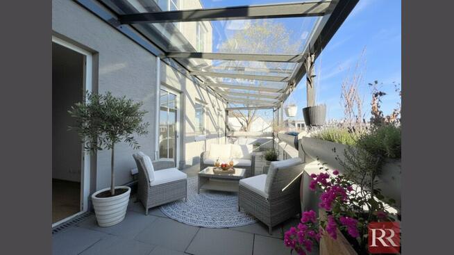 Eine Besonderheit der Wohnung ist die große Terrasse. Sie bietet mit ca. 23,5m² in der warmen Jahreszeit viel Platz für Speisen, aber auch eine gemützliche Terrassenlounge. Eine Glasüberdachung mit integrierter Markise macht sie für jedes Sommerwetter tauglich.