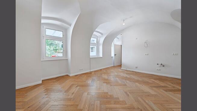 Über den Vorraum mit Platz für eine Garderobe, gelangt man in das moderne Badezimmer und das gemütliche Wohn-/Schlafzimmer mit ca. 23 qm. Das Bad bietet Platz für eine Dusche, ein WC, ein Handwaschbecken sowie einen Handtuchheizkörper. Der Wohnraum verleiht durch seine charmante Gewölbedecke und behaglichem Eichenparkett ein angenehmes Wohngefühl. Die Raumhöhe beträgt ca. 3 m.