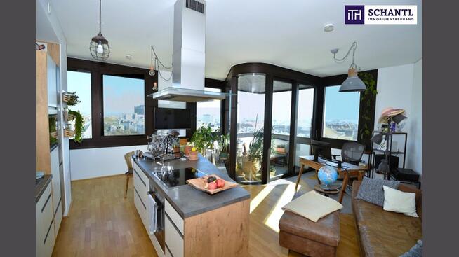 * lichtdurchflutete Wohnküche mit offenem Blick über die Dächer Wiens bis zum Horizont