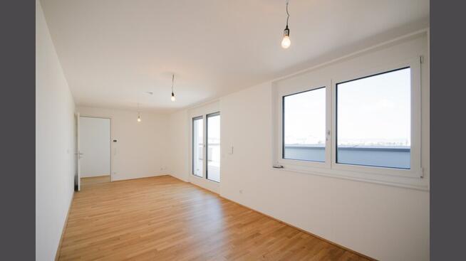 Der großzügig geschnittene Wohnbereich zur Rechten samt Terrasse bilden das Herzstück der tollen Wohnung. Hier finden Sie auf über 23 m² wunderbar Platz, um es sich ganz nach persönlichem Geschmack einzurichten und zu gestalten. Küchenanschlüsse für die individuelle Traumküche sind selbstverständlich vorbereitet. Die vorgelagerte Terrasse und der Balkon lassen viel Licht in den Raum und bilden mit fast 29 m² ein herrliches Refugium im Freien.