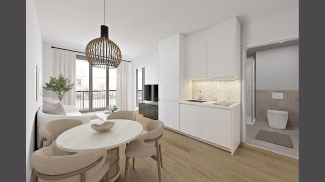 Nach dem Betreten der rund 32 m² großen 2-Zimmer-Wohnung befindet man sich bereits in der Wohnküche mit knapp 17 m². Der Raum ist offen gestaltet und bietet viel Licht aufgrund der großen Terrassentüren und dem Blick auf den eignen vorgelagerten Dachgarten. Hier lassen sich eine Couch und ein gemütlicher Essbereich wunderbar platzieren. Sämtliche Anschlüsse für die zukünftige Planung seiner individuellen Küchenzeile sind natürlich vorbereitet.