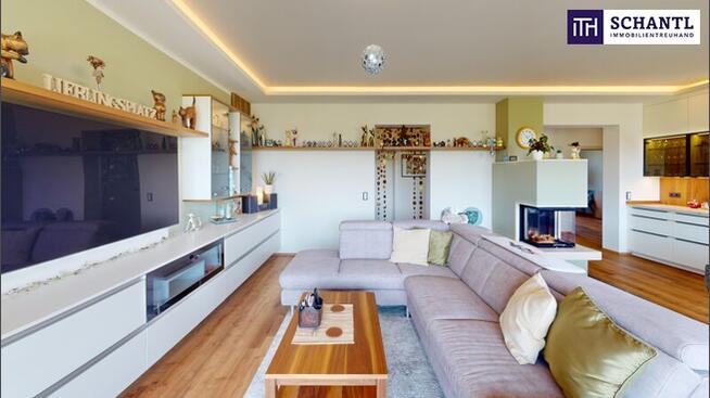 Das Herzstück bildet der lichtdurchflutete Wohn-Essbereich mit Panoramakamin und integrierter, sehr hochwertiger Designküche mit Echtstein-Arbeitsplatte – die liebevoll gearbeiteten Details wie z.B. polierte Steinadern in der Oberfläche und die indirekte Beleuchtung unterstreichen den exklusiven Charakter. Eine separate Vorbereitungsküche, die als Waschküche mit Platz für erhöhte Waschmaschine und Trockner konzipiert wurde, erfüllt höchste funktionale Ansprüche und ist dabei optisch perfekt eingebunden – ein Raum, von dem viele träumen.