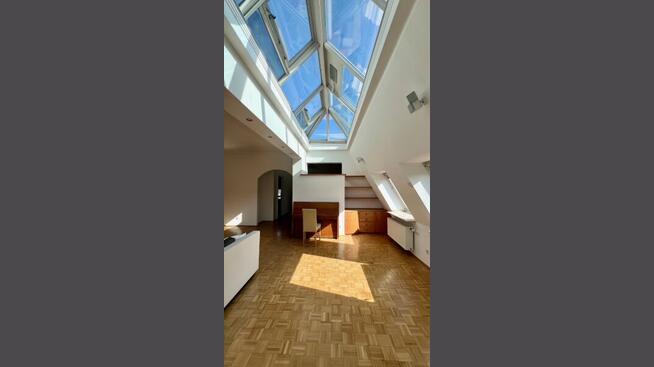 Man betritt die 4-Zimmer-Dachgeschosswohnung über das helle gepflegte Stiegenhaus und einen Vorraum, von welchem sämtliche Räumlichkeiten zentral begehbar sind. Das Vorzimmer mit etwa 10 m² Größe bietet guten Platz für eine Garderobe und Schuhschränke. Gleich nach dem Eintreten liegt zur Rechten das Herzstück der Wohnung, das Wohnzimmer mit über 45 m² Wohnfläche, großen Dachschrägen-Fenstern und einer gläsernen Lichtkuppel (zum Öffnen und mit Beschattung). Dadurch erstrahlt dieser Raum in ganz besonderem Licht und mit einzigartigem Flair.