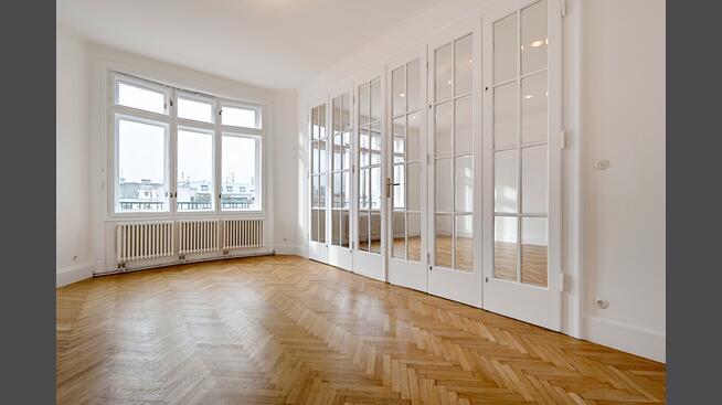 Edler Fischgrätparkett, einzigartige Türvertäfelungen, großflächige Glastüren mit Facettenschliff, sowie großzügige Fensterflächen und unverbauter Ausblick schaffen ein lichtdurchflutetes, stilvolles Ambiente und unterstreichen den unverwechselbaren Charakter dieser charmanten Altbauresidenz aus dem Fin de Siecle.