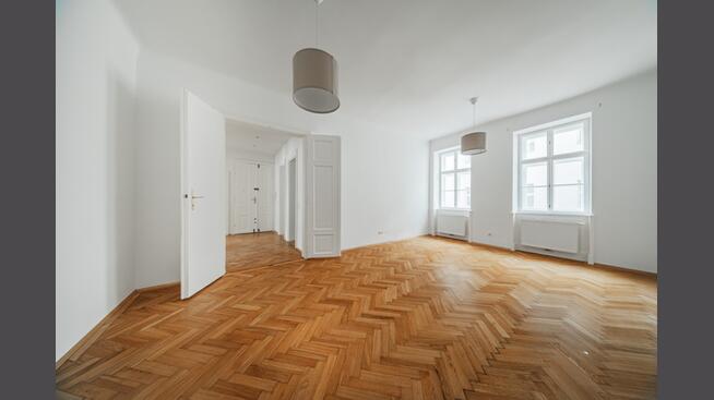 Die hohen Räume und die klassischen Altbaudetails – wie Parkettböden und Flügeltüren – verleihen der Wohnung ein repräsentatives Wohngefühl und unterstreichen den typischen Wiener Altbaucharakter.