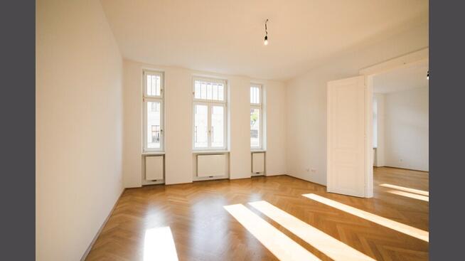 Der Vorraum mündet in einen Korridor, welcher danke großer Milchglasfenster in einen Lichthof einen angenehmen Lichteinfall bietet. Von hier gelangt man in das Schlafzimmer, das mit über 24 m² Größe samt idealem quadratischen Schnitt, dazu einladet ein Doppelbett, Kommoden und Schränke zu platzieren. Große Flügeltüren und schöner Fischgrätparkett betonen den Altbau-Flair der Raumes. Die wunderbaren Flügeltüren bilden die Trennung zum Wohnbereich, welcher von hier, als auch vom Vorraum zu begehen ist. Der Wohnbereich ist mit 24 m² ähnlich dimensioniert, bietet eine herrliche Westausrichtung und lässt sich mondän und nach individuellem Geschmack einrichten.